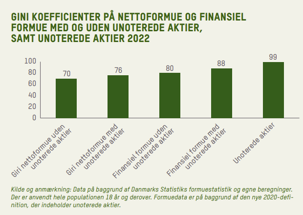 Uligheden i nettoformuer når man inkluderer unoterede aktier er 76. Altså en markant større ulighed end for indkomster. Ser man på finansielle formuer fra værdipapirer er GINI-koefficienten 88, hvilket indebærer, at de allerrigeste ejer langt størstedelen af de finansielle formuer. For de unoterede aktier – selskaber der ikke er noteret på børsen, typisk familiejede – er Gini-Koefficienten 99, hvilket peger på, at det er meget få familier, der ejer langt størstedelen af de unoterede aktier.