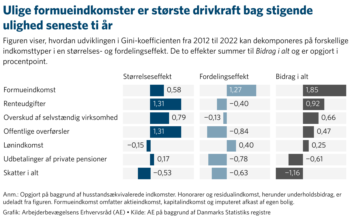 Samtidigt har afkast fra formuer også betydning for fordelingen af indkomst, gennem den ulige fordeling af afkast. En analyse fra AE-rådet i 2024 viste at formueindkomst er den største drivkraft bag den stigende ulighed i det sidste årti.