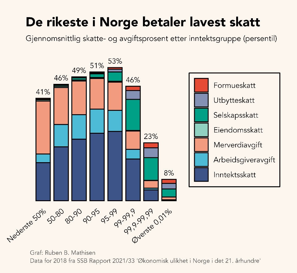 Eksempelvis beretter The Guardian at en af Norges rigeste mænd, Gustav Magnar Witzøe, ingen indkomstskat betalte i 2023, da han ikke havde haft nogle indtægter, men formueskatten sikrede, at han bidrog med 330 millioner norske kroner. Tal fra den Norske pendant til Dansk Statistik viser, at de super-rige i Norge generelt stort set ikke betaler indkomstskat, og at deres relative bidrag gennem forbrugsskatter også er meget lavt sammenlignet med alle andre grupper: