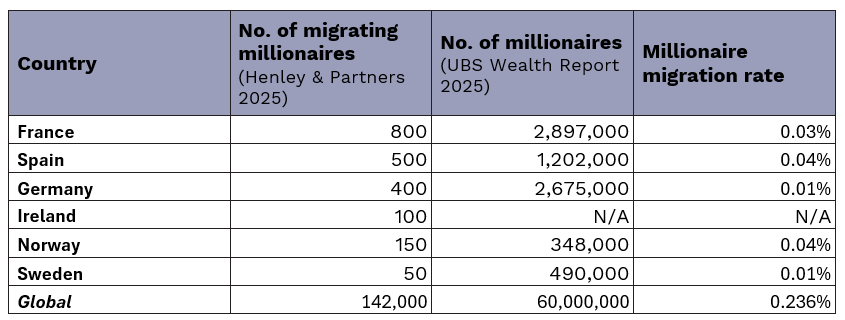 For det andet har meget af debatten om de hundredevis af flyttede Norske millionærer ikke sat antallet i relation til det samlede antal millionærer, som Norge har. Det kan lyde voldsomt, at hundrede millionærer flytter, men når det er ud af en befolkning af næsten 350,000 dollar-millionærer, så udgør fraflytningen stadig promiller, som det fremgår af tabellen nedenfor: