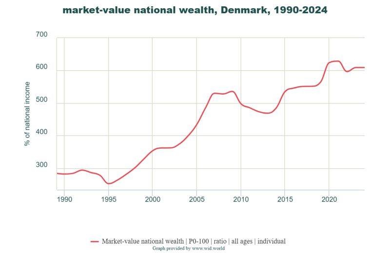 Formue er langt mere ulige fordel end indkomst. Samtidigt er spørgsmålet om beskatning af formue blevet vigtigere i takt med forandringen af økonomien. De sidste års stigende formue, som følge af boligformue og aktieboom har betydet at ejerskab og formue spiller en større rolle i samfundsøkonomien. Den samlede formue i Danmark er siden 1990 steget fra ca. tre gange den årlige nationalindkomst til ca. seks gange, som man kan se i figuren under, med tal fra World Inequality Database.